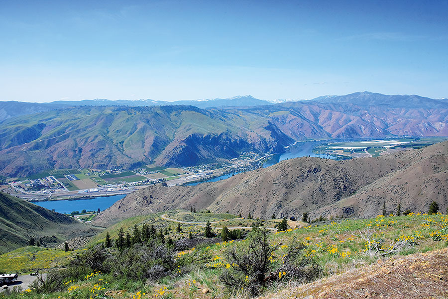 The 60-foot-long mural celebrates an integral part of the region’s agricultural history. Beginning in 1902, an aerial tram located north of Orondo carried sacks of wheat from the plateau 2 miles down the bluffs to the Columbia River, crossing several canyons along the way. At the river, grain was loaded into steamboats and shipped to the Great Northern railroad in Wenatchee. According to newspaper articles from the time, the tram had the capacity to move 12-15 tons of cargo per hour and cost between $25,000 and $30,000 to build.