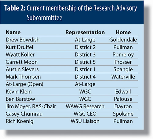 Recruiting farmers into leadership roles is never easy. Time is the scarcest resource in agriculture, and asking growers to take on meaningful RAS responsibilities demands thoughtful consideration. Recruiting was critical. The RAS must be representative of the diverse environmental and geographic growing regions in Washington. To achieve the breadth of coverage of the Washington grain industry, the WGC commissioners decided the RAS should have 10 members: two WGC commissioners, the research chair from WAWG, one grower from each of the five WGC districts, and two at-large grower members. A member of WGC staff and the WSU liaison serve as ex officio members. The seven grower members were to be neither past WAWG board members or past WGC commissioners. Nominations for the RAS were solicited from WGC commissioners, WAWG board members, county grain grower presidents, researchers, and industry. It was considered essential to have nominations from the group they represent to have knowledgeable, accountable, and dedicated members of RAS. A document describing RAS and individual responsibilities and expectations was shared with each nominee prior to selection.
