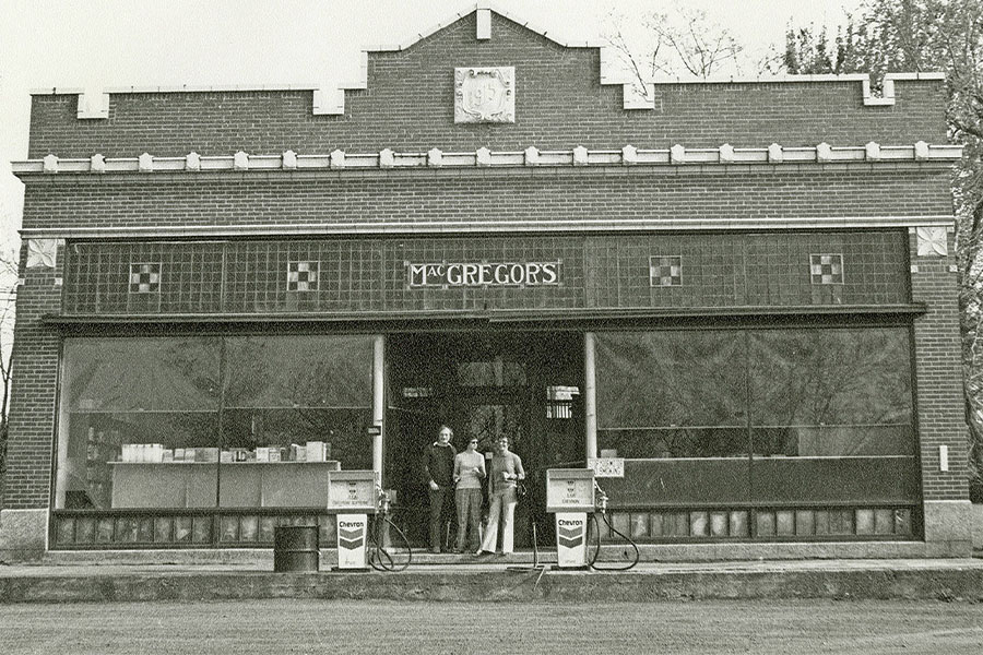 - Alex, Mary and Norma McGregor in front of their store, circa 1974. The McGregors built this store after the original one burned. It is one of three still standing, built at that time, designed by Pullman, Wash., architect William Swain. This building was built by the Esaum Brothers of Colfax, Wash., with building materials from the Colfax brick yard. Photographer unknown. Photo courtesy of the Whitman County Library, from the private collection of The McGregor Company. (WCL0211, washingtonruralheritage.org)